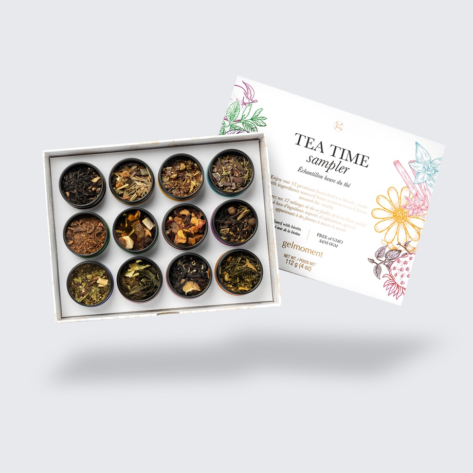 Discover your favourite of our 12 premium loose-leaf tea blends with gelmoment's NEW tea time sampler box. Our teas are all made from ingredients that we proudly source from women-owned farms around the world. Plus, our delicious blends are free of GMOs and infused with biotin, making them an eco-friendly beverage that also helps nourish your skin, nails, and hair.